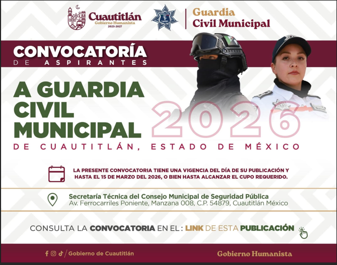 CUAUTITLÁN, Estado de México. — En un esfuerzo por robustecer la infraestructura de seguridad y garantizar el orden público bajo un enfoque de proximidad social, el Gobierno Municipal de Cuautitlán anunció el lanzamiento de la Convocatoria Guardia Civil 2026. Esta iniciativa busca integrar a mujeres y hombres con una marcada vocación de servicio para formar parte de una corporación fundamentada en la disciplina y el compromiso comunitario.