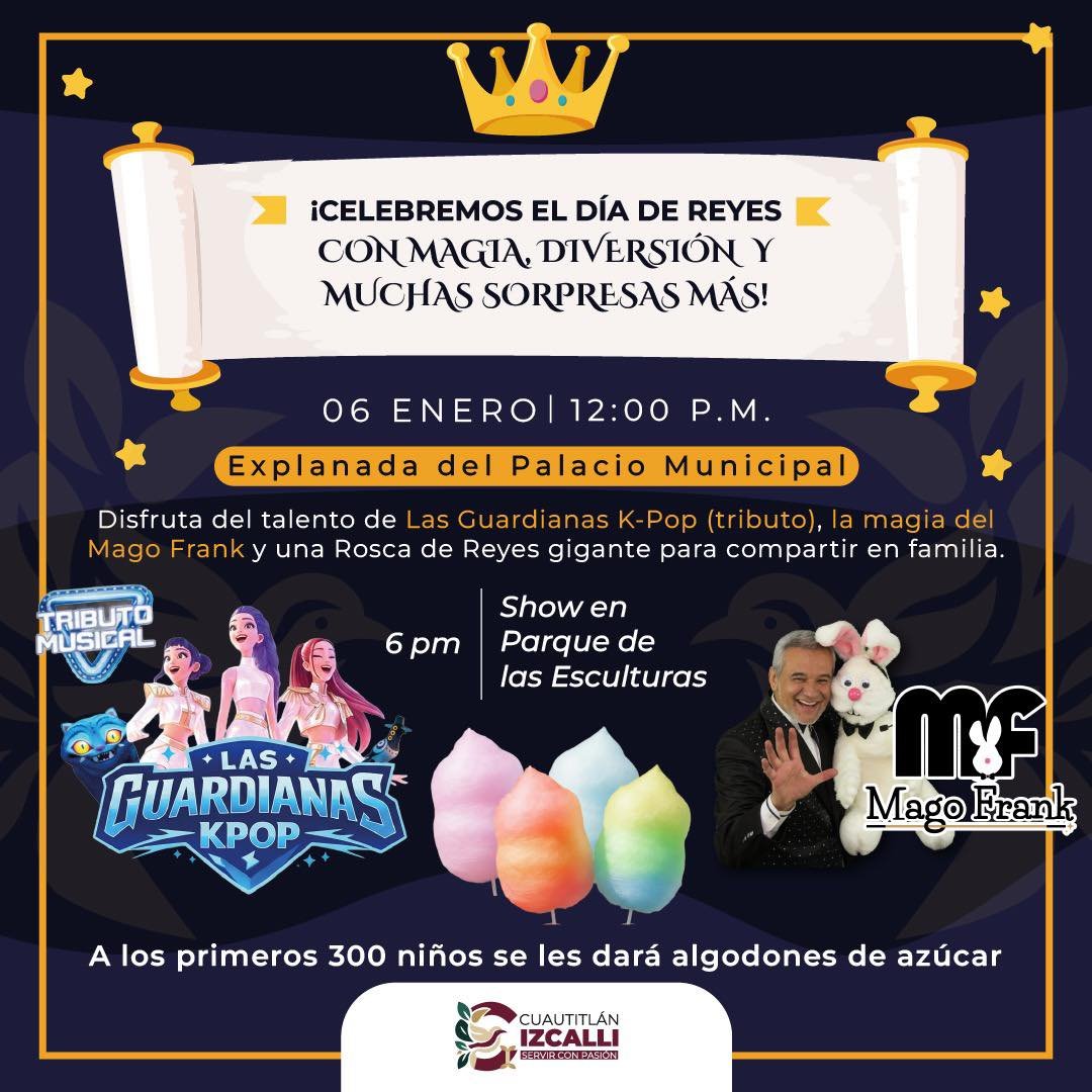 La cartelera artística estará encabezada por el espectáculo de «Las Guardianas K-Pop», un tributo musical diseñado para el público infantil y juvenil, seguido por la presentación estelar del Mago Frank, quien aportará el toque de ilusión y entretenimiento clásico a la jornada. Como parte del compromiso con la comunidad, las autoridades han anunciado la repartición de una Rosca de Reyes gigante, promoviendo así la unión entre los asistentes.