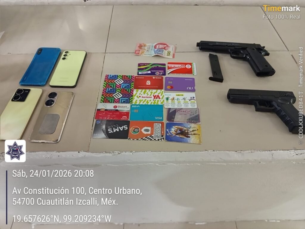 Tras un seguimiento inmediato y la coordinación de las fuerzas de seguridad, los sospechosos fueron localizados en la calle Itzcóatl. Al notar la presencia de las patrullas, los individuos intentaron huir a pie, pero fueron asegurados metros adelante por los uniformados. Durante la revisión preventiva, se les hallaron objetos con características similares a armas de fuego. Un detalle relevante proporcionado por las autoridades es que uno de los detenidos portaba un rastreador digital en el tobillo izquierdo.