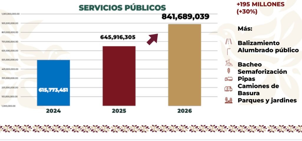 Para garantizar servicios públicos eficientes, se asignaron 841 millones 689 mil 039 pesos. Este monto, que creció un 30% en comparación con ejercicios anteriores, permitirá intensificar las labores de:
