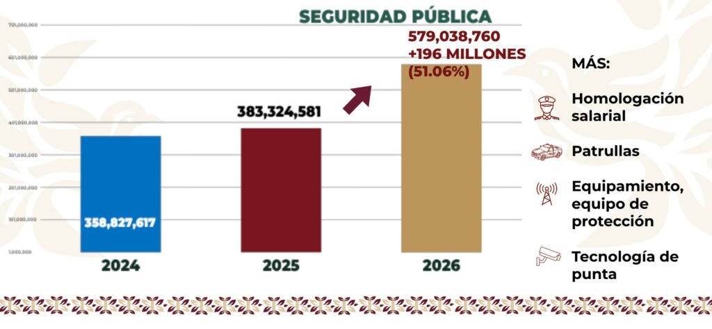 El rubro de seguridad ciudadana recibirá un impulso sin precedentes con un presupuesto de 579 millones 038 mil 760 pesos, lo que representa un aumento del 51% respecto al año 2024. Estos recursos se destinarán a la homologación salarial de los policías, adquisición de equipo de protección y la incorporación de tecnología de punta para la vigilancia del municipio.