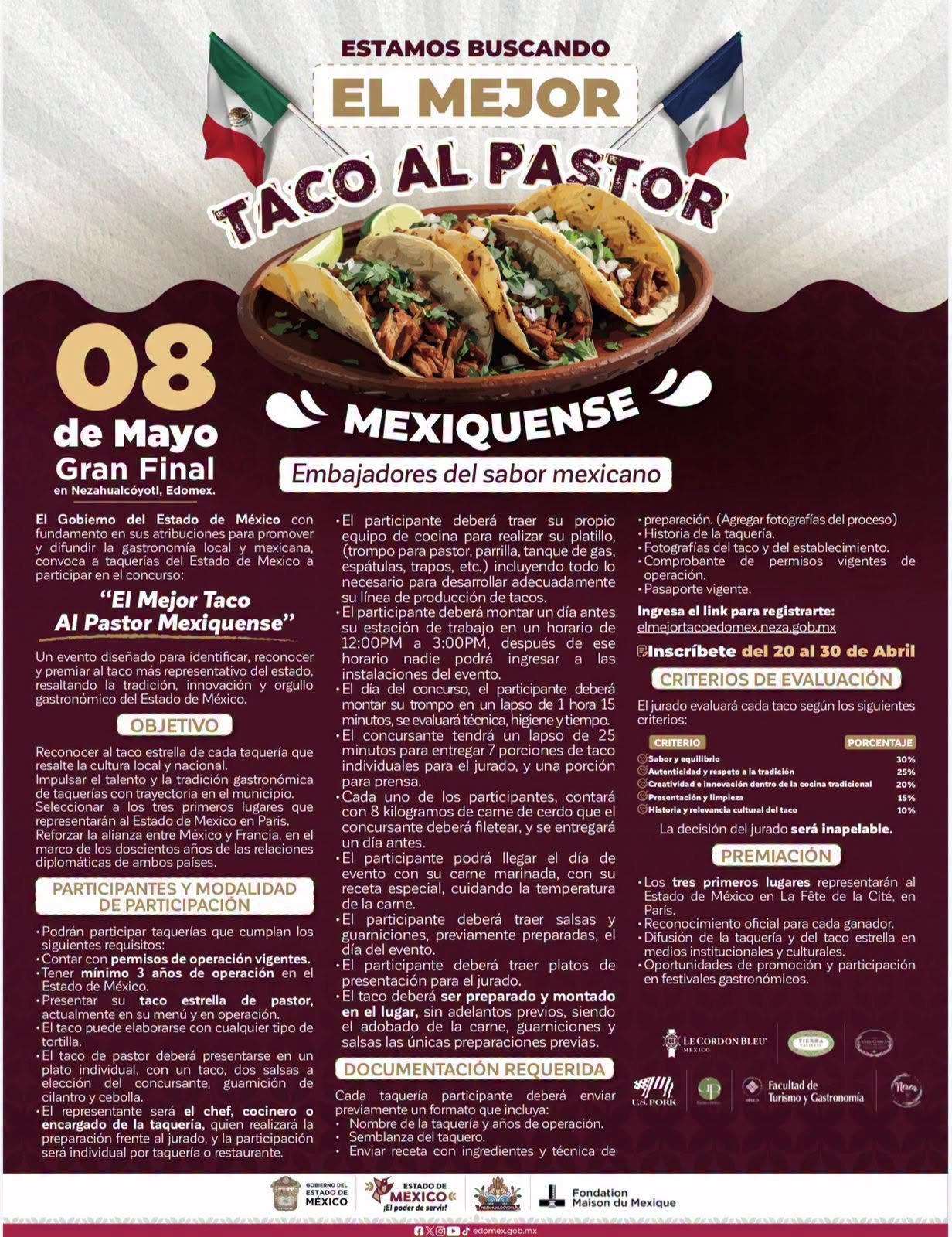 Dirigido a taquerías con al menos tres años de operación, el concurso premiará a los tres primeros lugares, quienes tendrán la oportunidad de participar en “La Fête de la Cité” en París, en conmemoración de los 200 años de relaciones diplomáticas entre México y Francia. Los participantes deberán presentar su taco al pastor, que será evaluado por un jurado especializado en criterios como sabor, autenticidad, presentación e historia cultural.